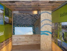 La puesta en escena de una membrana en un espacio de circulación sinuosa y continua, informativa y teatralmente ambientado e informativo que sugiere al espectador detenerse a digerir información amena y participativa de cultura educativa.